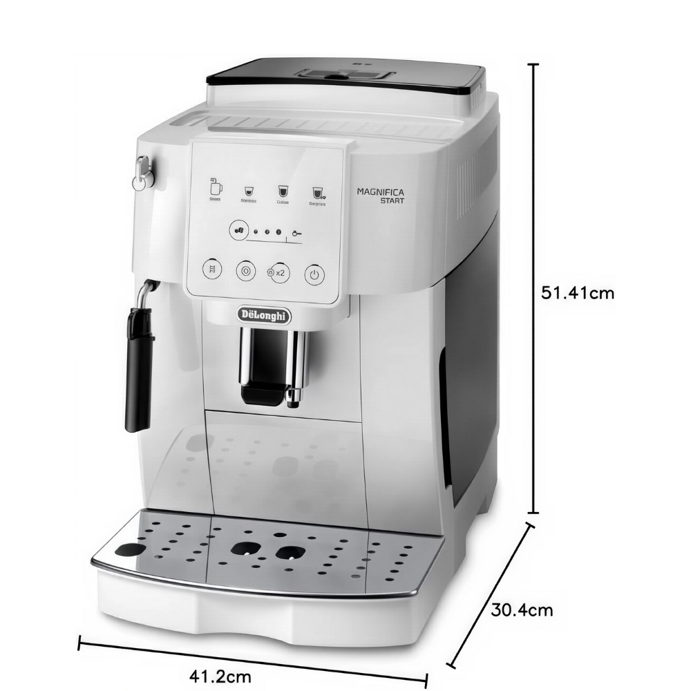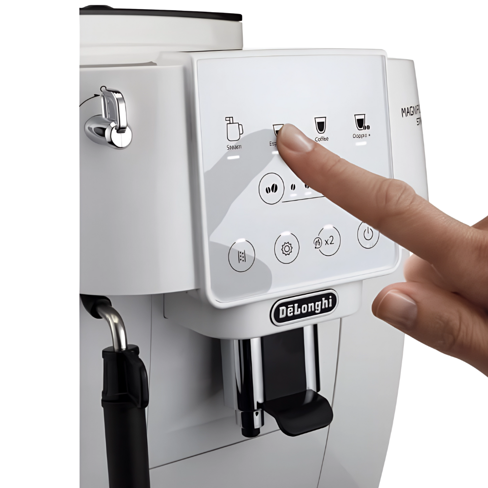 The intuitive control panel with backlit buttons allows you to choose and personalize drinks at a touch. A classic milk frother helps you prepare cappuccinos, lattes or simply add hot milk to your coffee. Designed in elegant white, the Magnifica Start combines modern style with long-lasting performance. Backed by an international warranty, this fully automatic coffee machine is perfect for home users who want fresh coffee with barista quality at the press of a button.
