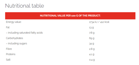 derived from cereals 33% (oat flakes, corn grits, corn flour, rice flour), glucose syrup, vegetable fats (non hydrogenated palm fat*, palm kernel oil, shea) in varying proportions, sugar, dried plums 10% (plums, rice flour), whey powder (from milk), humectant: sorbitols; unrefined cane sugar, flavouring, acidity regulator: citric acid; emulsifier: lecithins (soy), salt, sea salt, barley malt extract, natural vanilla flavouring.