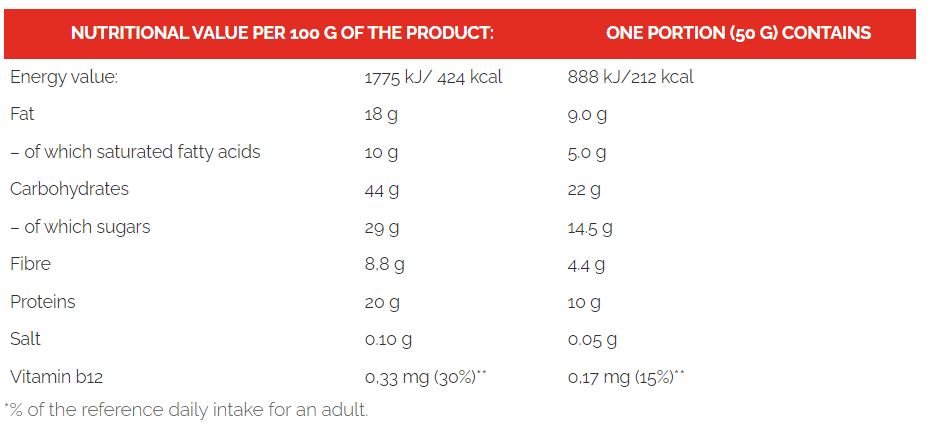 NUTRITIONAL VALUE PER 100 G OF THE PRODUCT: ONE PORTION (50 G) CONTAINS
